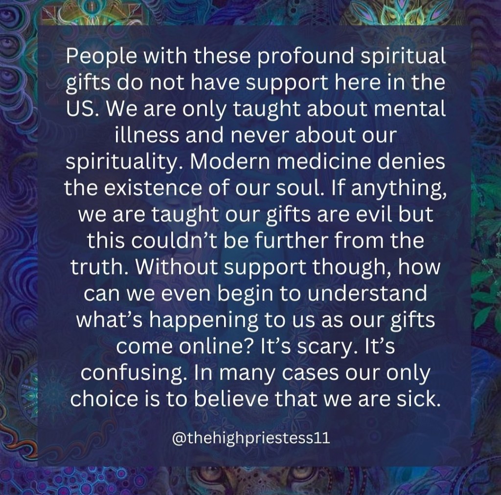 I’ve been in the mental health field for approx 13 years, and the overlap between mental health concerns and spiritual gifts has been in the forefront of my mind for about the last 5; but I remember wondering about it as early as 2009 during my grad school internship on post at FT Jackson, when I was asked to sit with a soldier that was having what was termed a “psychotic break.”